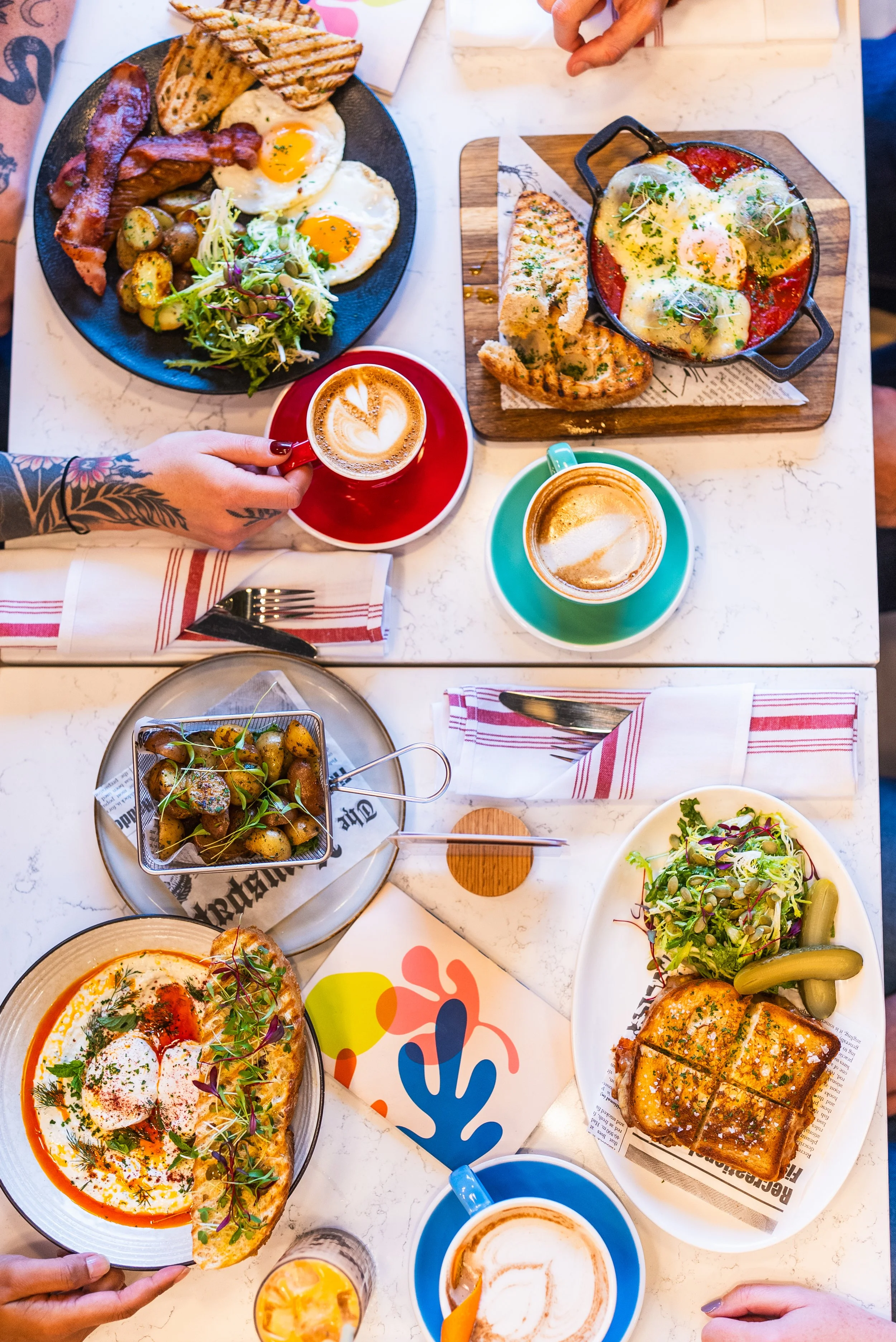 Roasted peppers, tomatoes, fresh herbs, eggs, feta cheese, sourdough